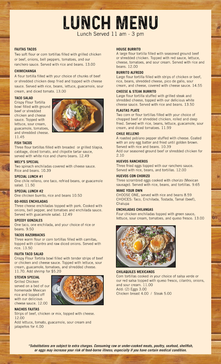Two soft flour or corn tortillas filled with grilled chicken or beef, onions, bell peppers, tomaotoes and our ranchero sauce. Served with rice and beans.