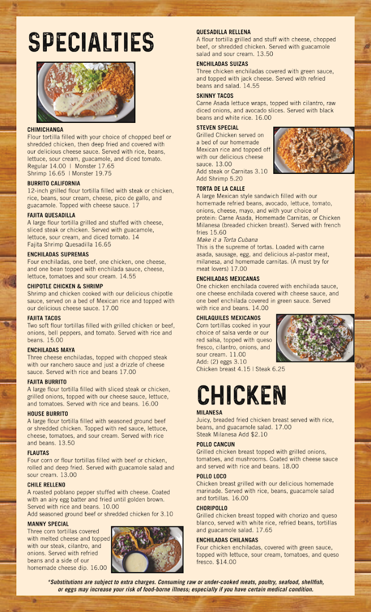 Large flour tortilla filled with strips of chicken or beef, rice, beans, shredded cheese, pico de gallo, sour cream and cheese topped with cheese sauce.